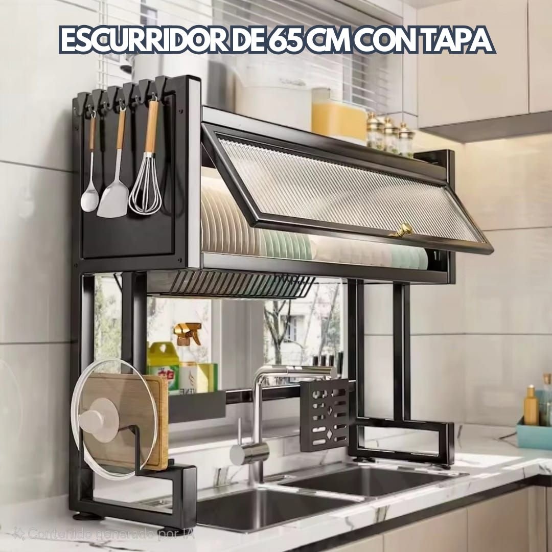 Este escurridor con tapa mantiene tus platos protegidos del polvo, insectos y humedad mientras los organiza de forma inteligente. Su diseño inclinado permite que el agua escurra sin ensuciar, manteniendo tu mesón completamente seco y limpio.
